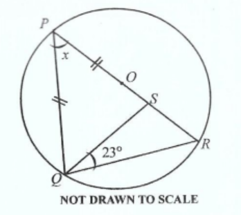 **DIAGRAM WILL BE PROVIDED.** In the diagram, \(O\) is the centre of the circle \(PQR\), \(|PS| = |PQ|\) and \(\angle RQS = 23^\circ\). Find the value of \(x\).