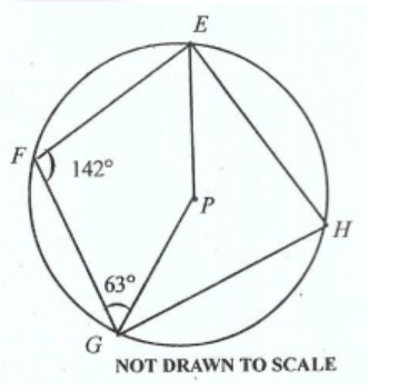 **DIAGRAM WILL BE PROVIDED.** In the diagram, \(EFGH\) are points on a circle centre \(P\). If \(\angle EFG = 142^\circ\) and \(\angle FGP = 63^\circ\), find \(\angle FEP\).