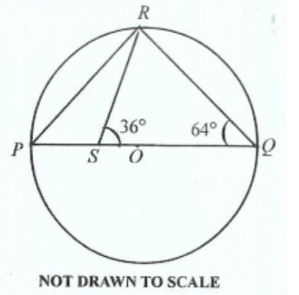 **DIAGRAM WILL BE PROVIDED.** In the diagram \(PQ\) is the diameter of circle \(PQR\) with centre \(O\) and \(RS\) meets \(PQ\) at \(S\). If \(\angle RQP = 64^\circ\) and \(\angle RSQ = 36^\circ\), find \(\angle PRS\).